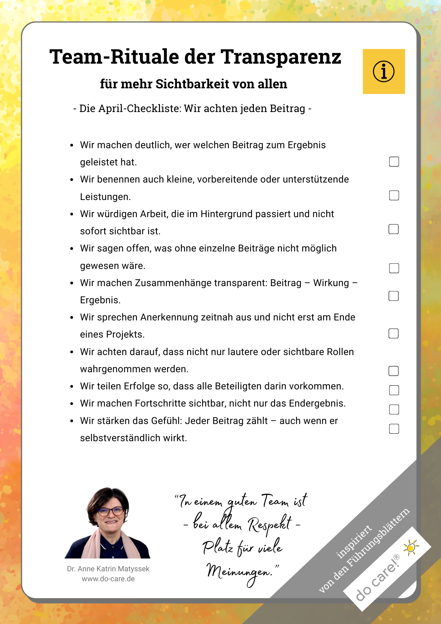 Wenn Sie möchten, formulieren Sie dazu Erinnerungshilfen (PostIt, Terminchen im Outlook, Bildschirmschoner), damit das Sich-Gesehen-Fühlen und Gefühle von Stolz und Verbundenheit in Ihrem Team wachsen können.