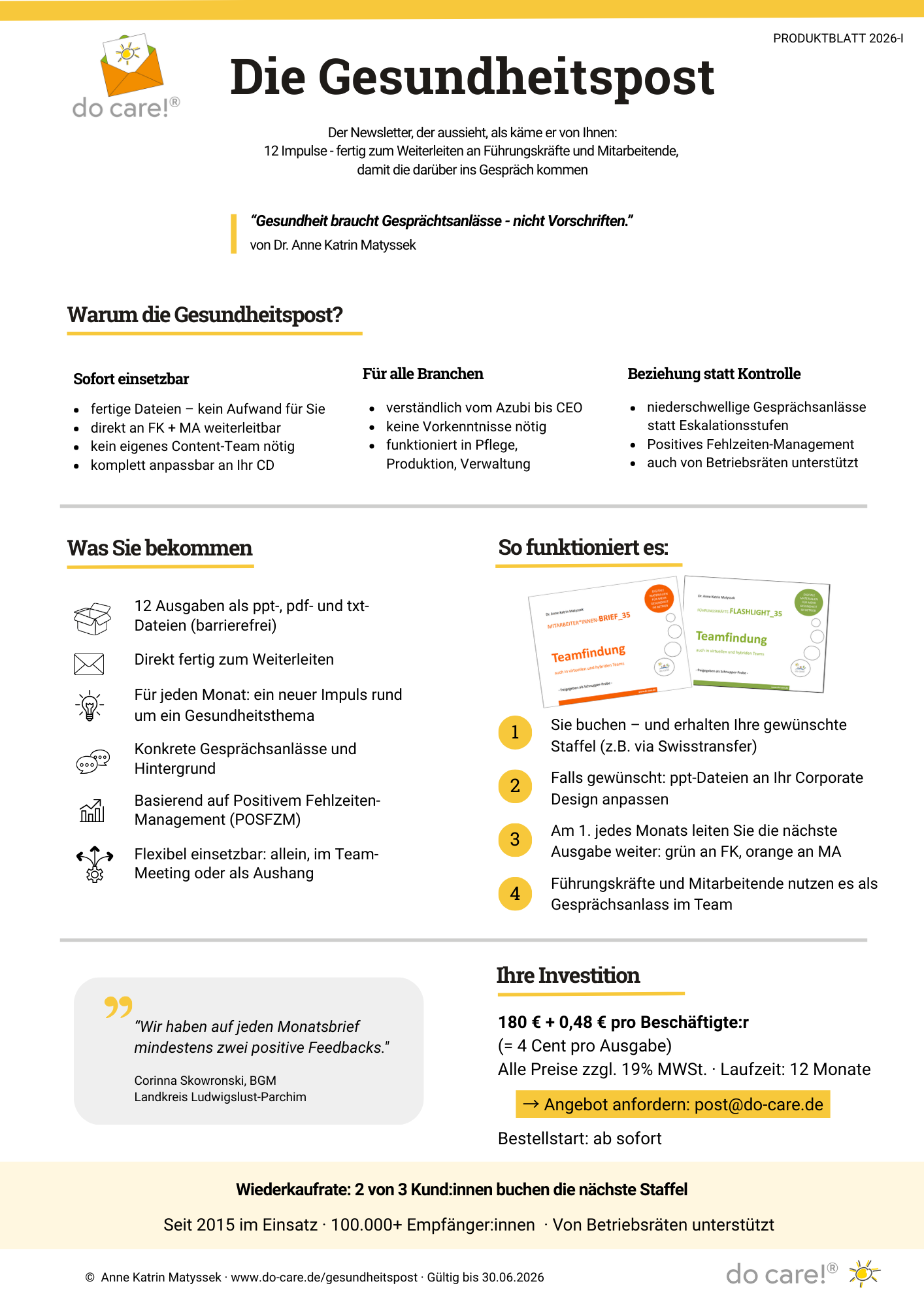 Das 2-seitige Produktblatt enthält die Zahlen-Daten-Fakten zur Gesundheitspost sowie Erfolgskriterien für BGM, die von Teilnehmenden eines Branchen-Treffens (incl. 2 Personalrätinnen) genannt wurden: